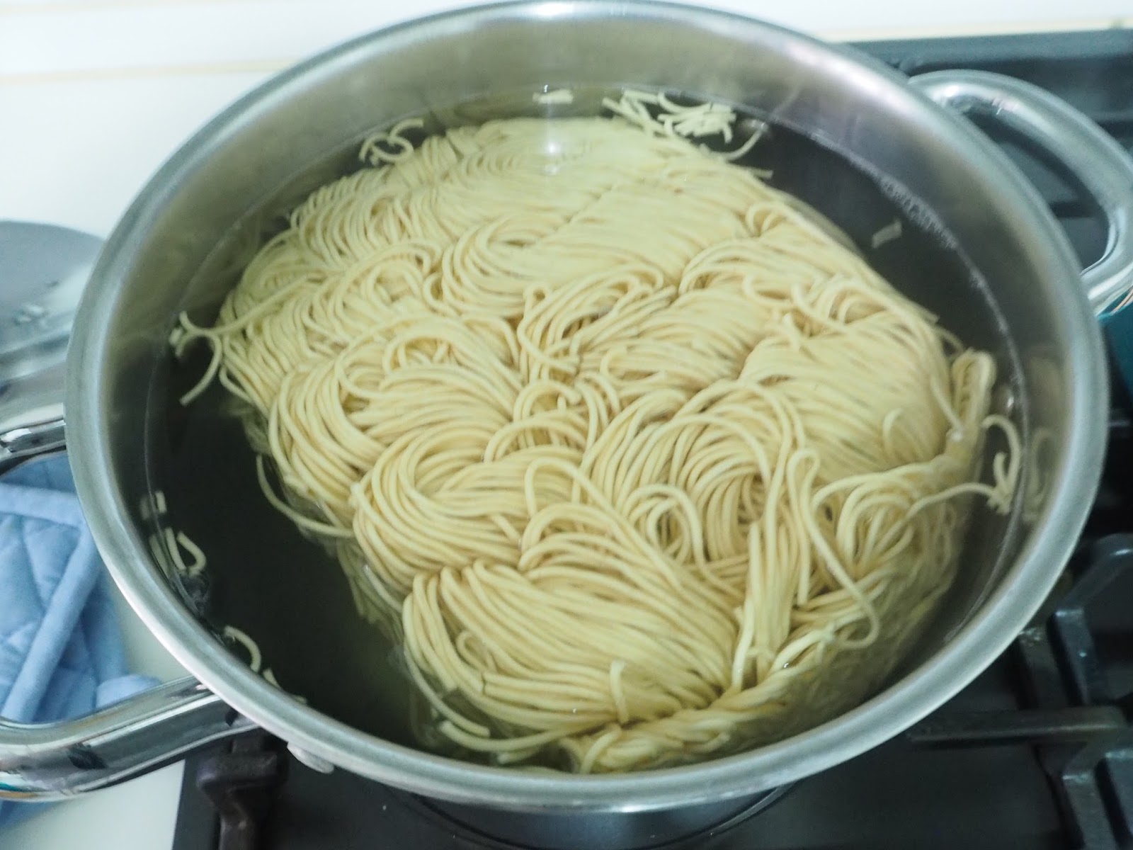 - En un cazo ponemos agua a hervir según las indicaciones de la bolsa de los fideos. Cuando llegue a ebullición, apagamos el fuego y dejamos los fideos unos minutos. Luego los escurrimos bien (seguid las instrucciones que os vengan en la bolsa).